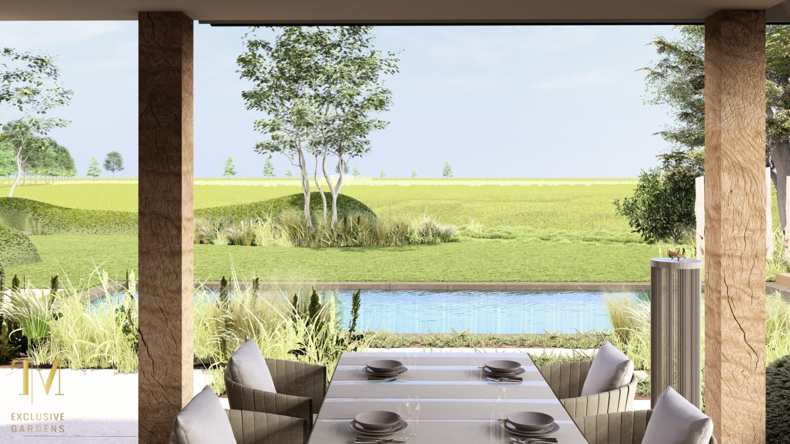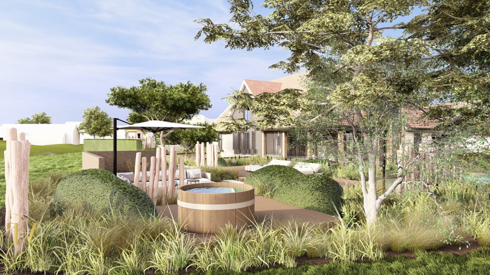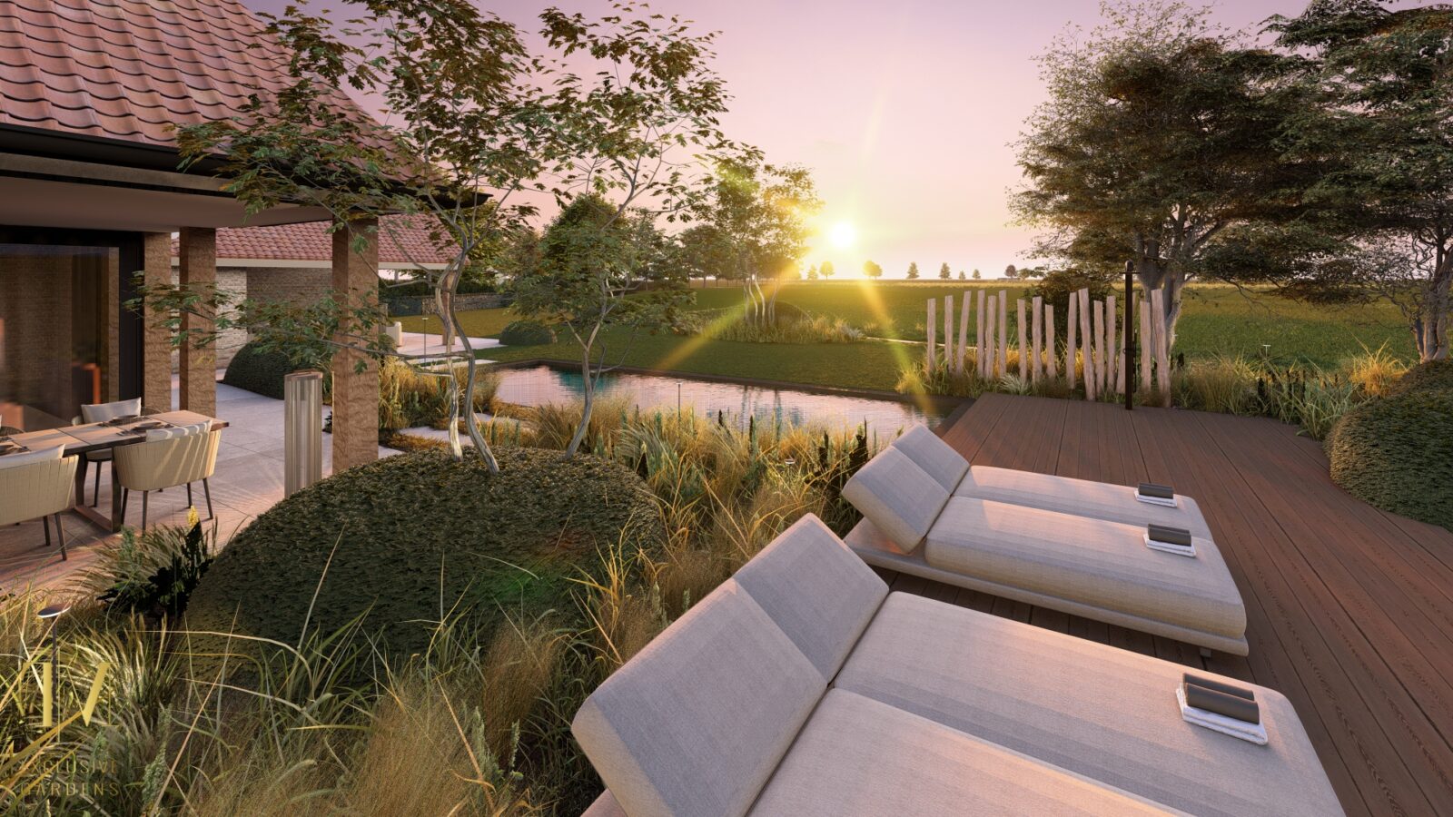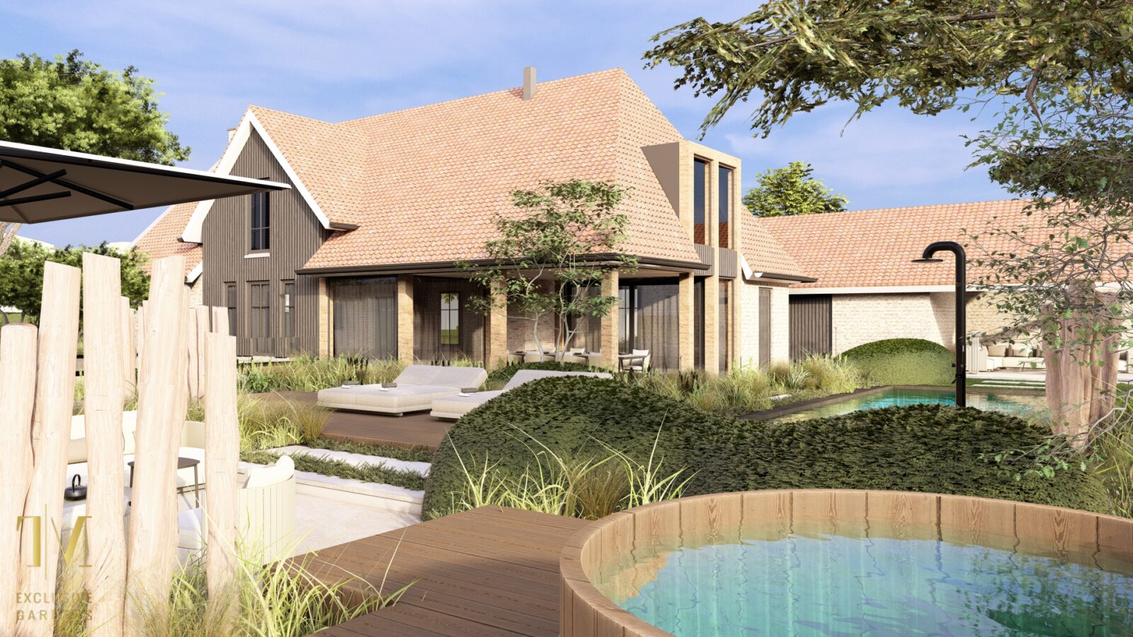 Vanuit de woning kijk je over het zwembad de verte in. Zorgend voor een ultiem vakantiegevoel en ongekende rust. Het zachte kleurenpalet in combinatie met natuurlijke materialen vloeien naadloos samen met het landschap.