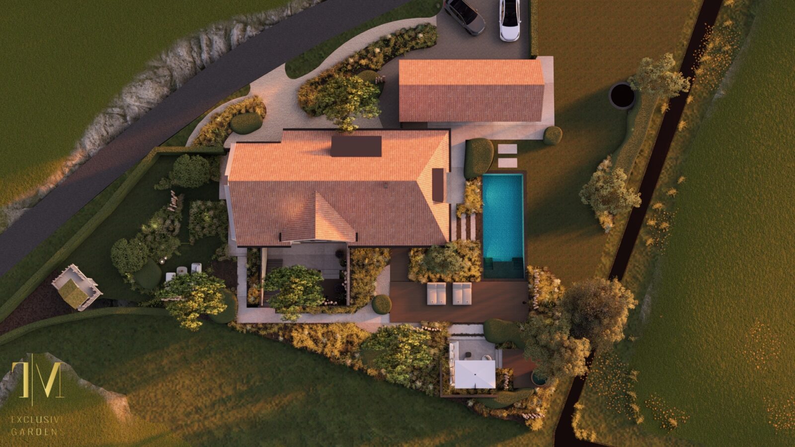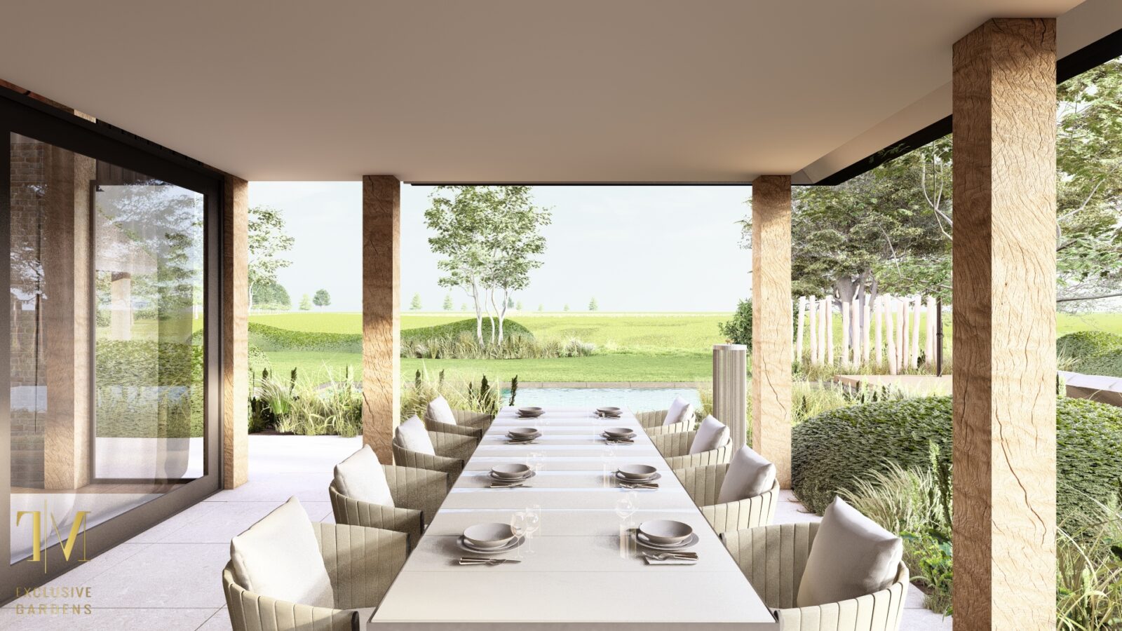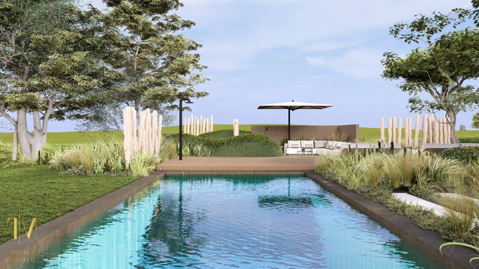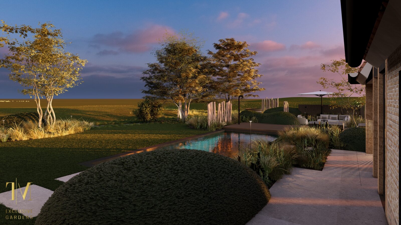 Vanuit de woning kijk je over het zwembad de verte in. Zorgend voor een ultiem vakantiegevoel en ongekende rust. Het zachte kleurenpalet in combinatie met natuurlijke materialen vloeien naadloos samen met het landschap.