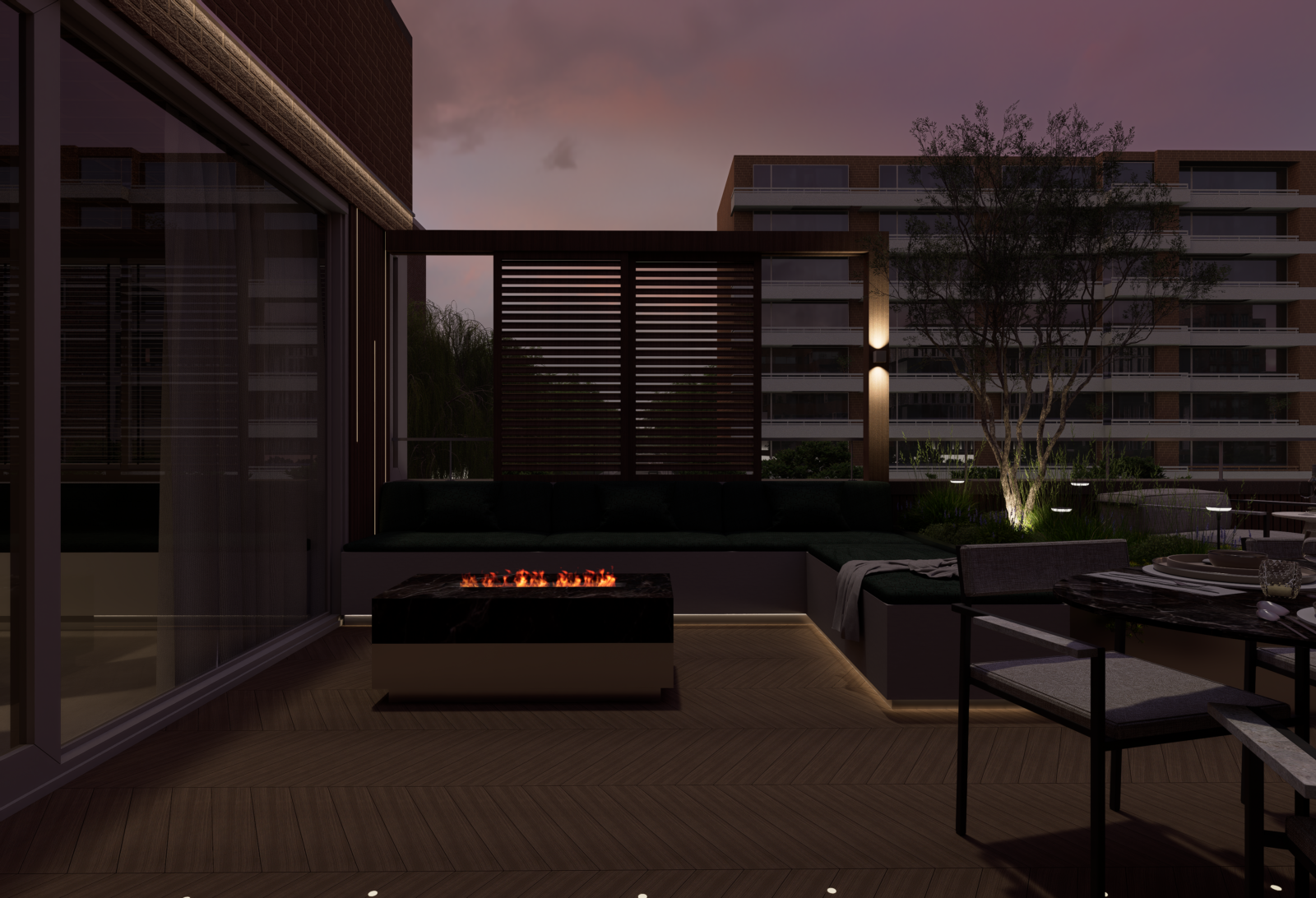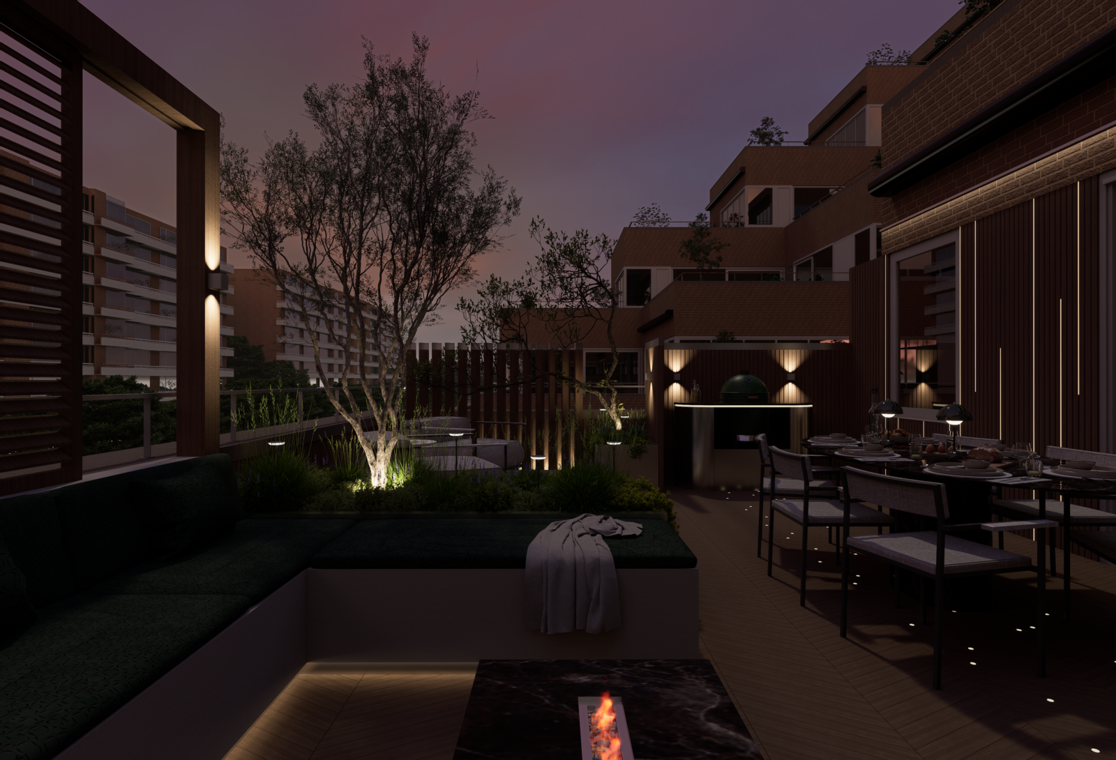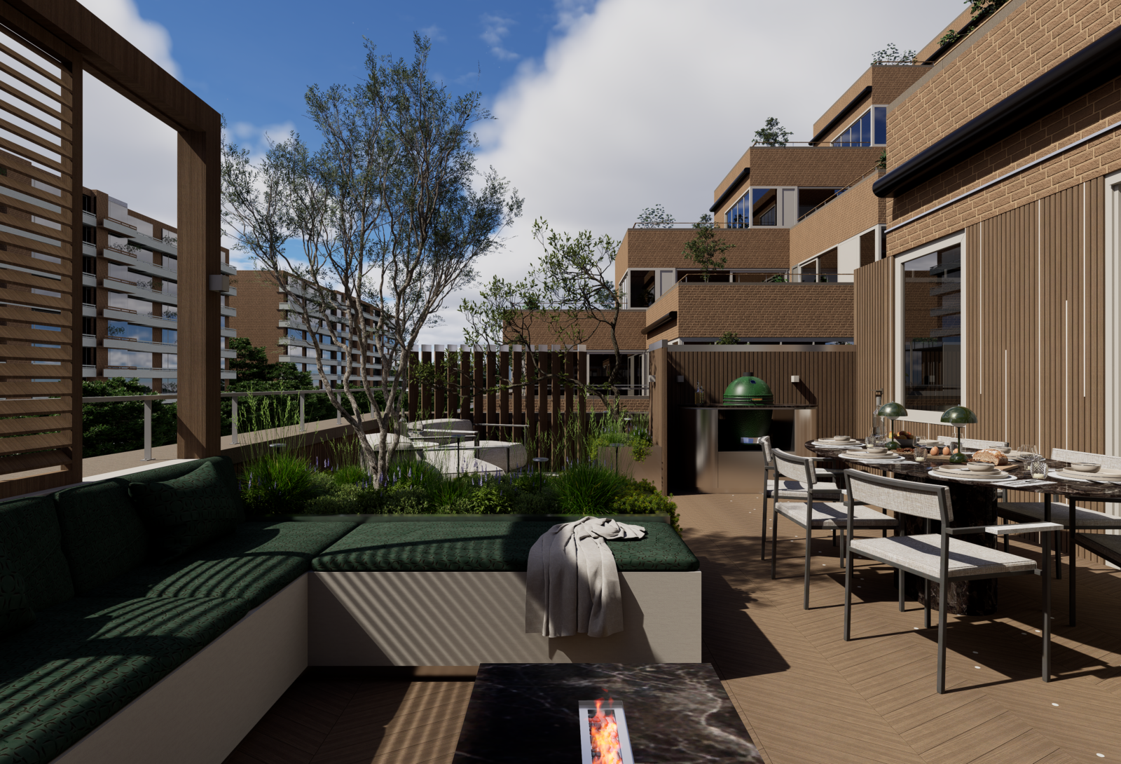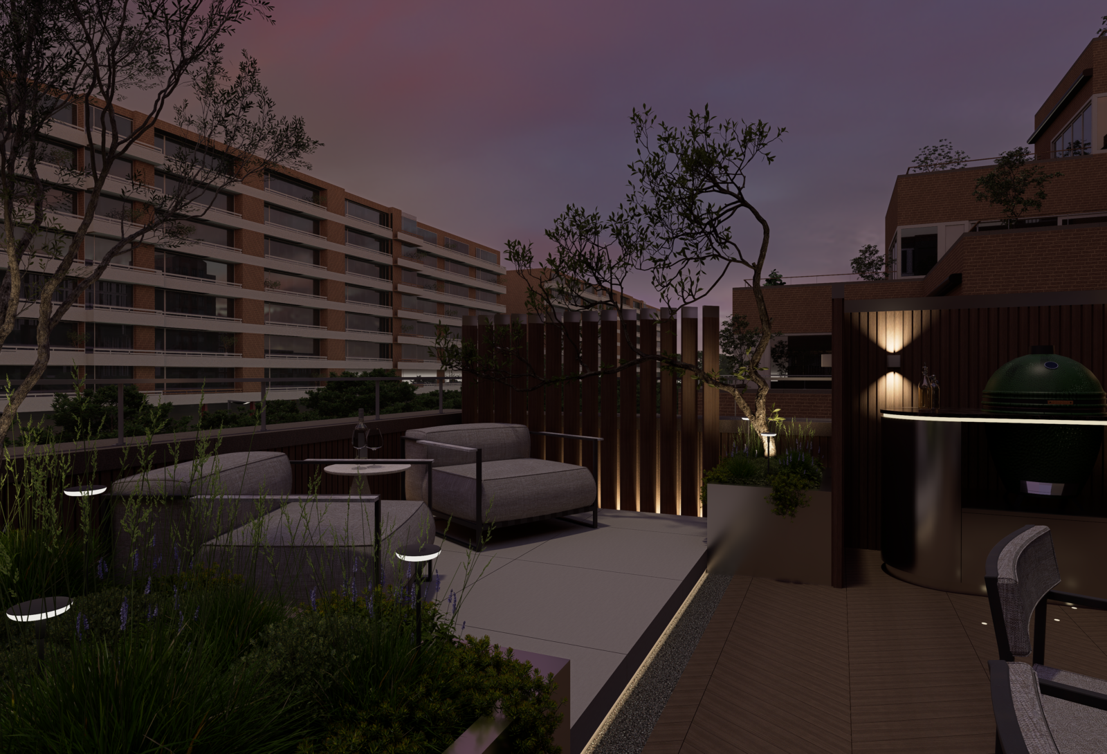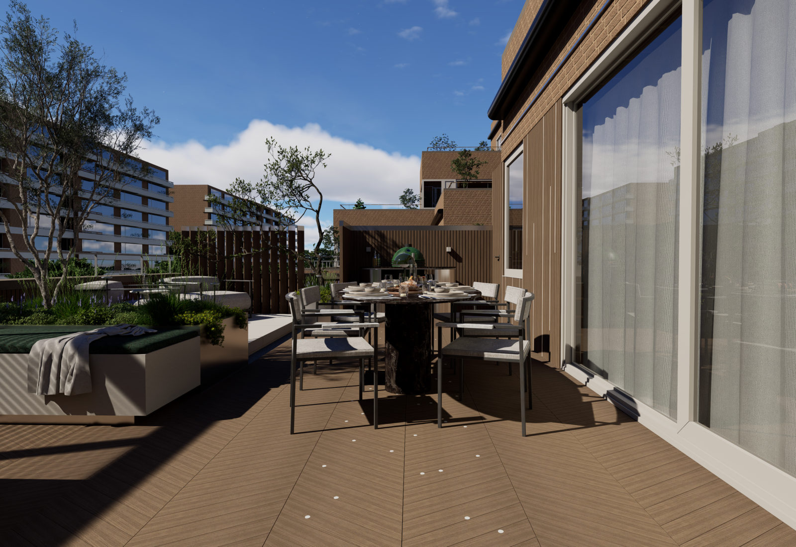 Door slim gebruik te maken van indeling, groen en materialen is een comfortabele buitenruimte ontstaan waar je kunt ontspannen, samenkomen en genieten van het uitzicht over de stad.