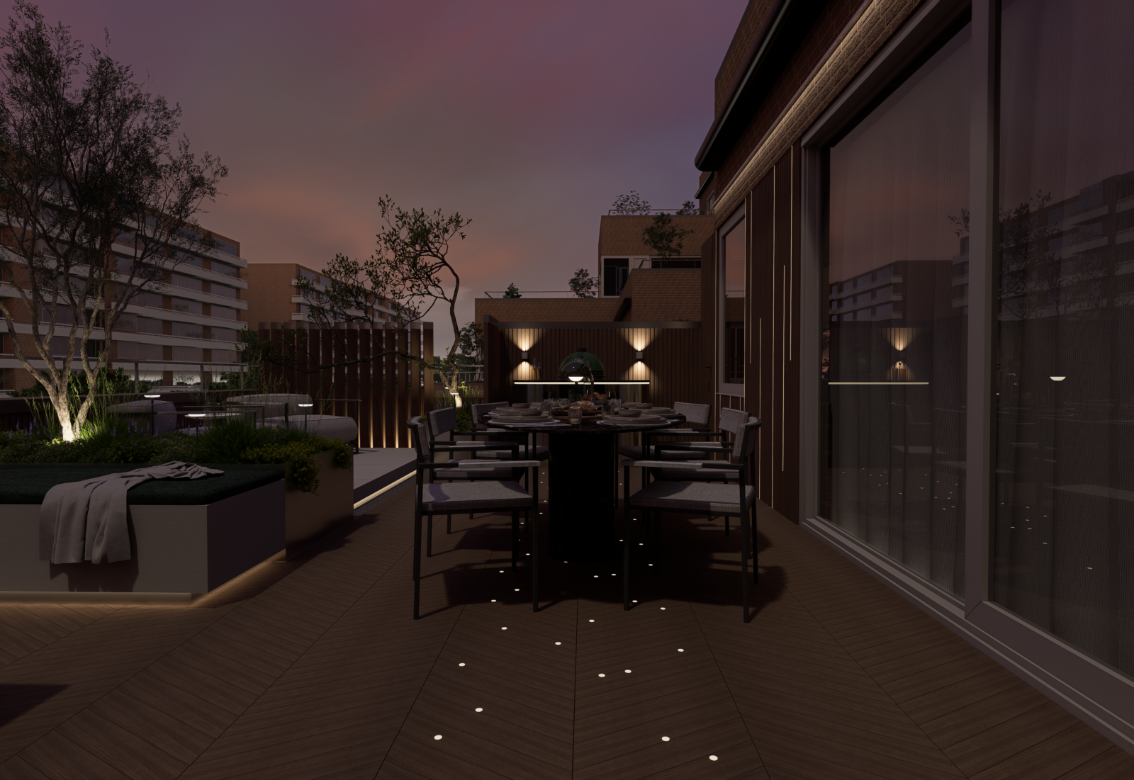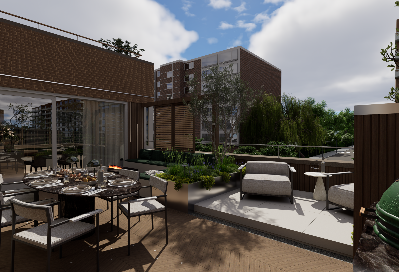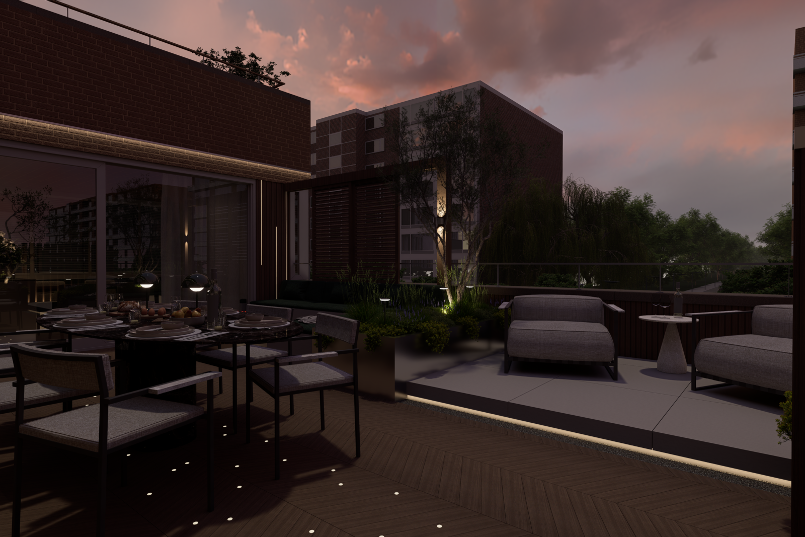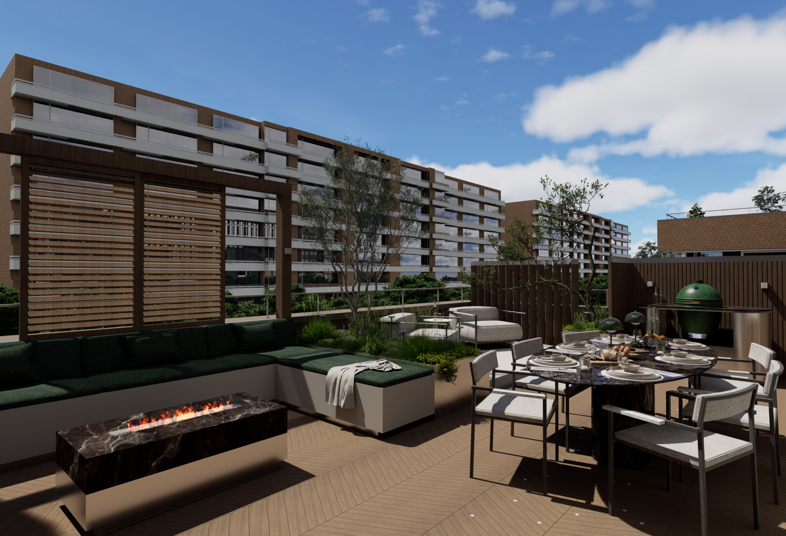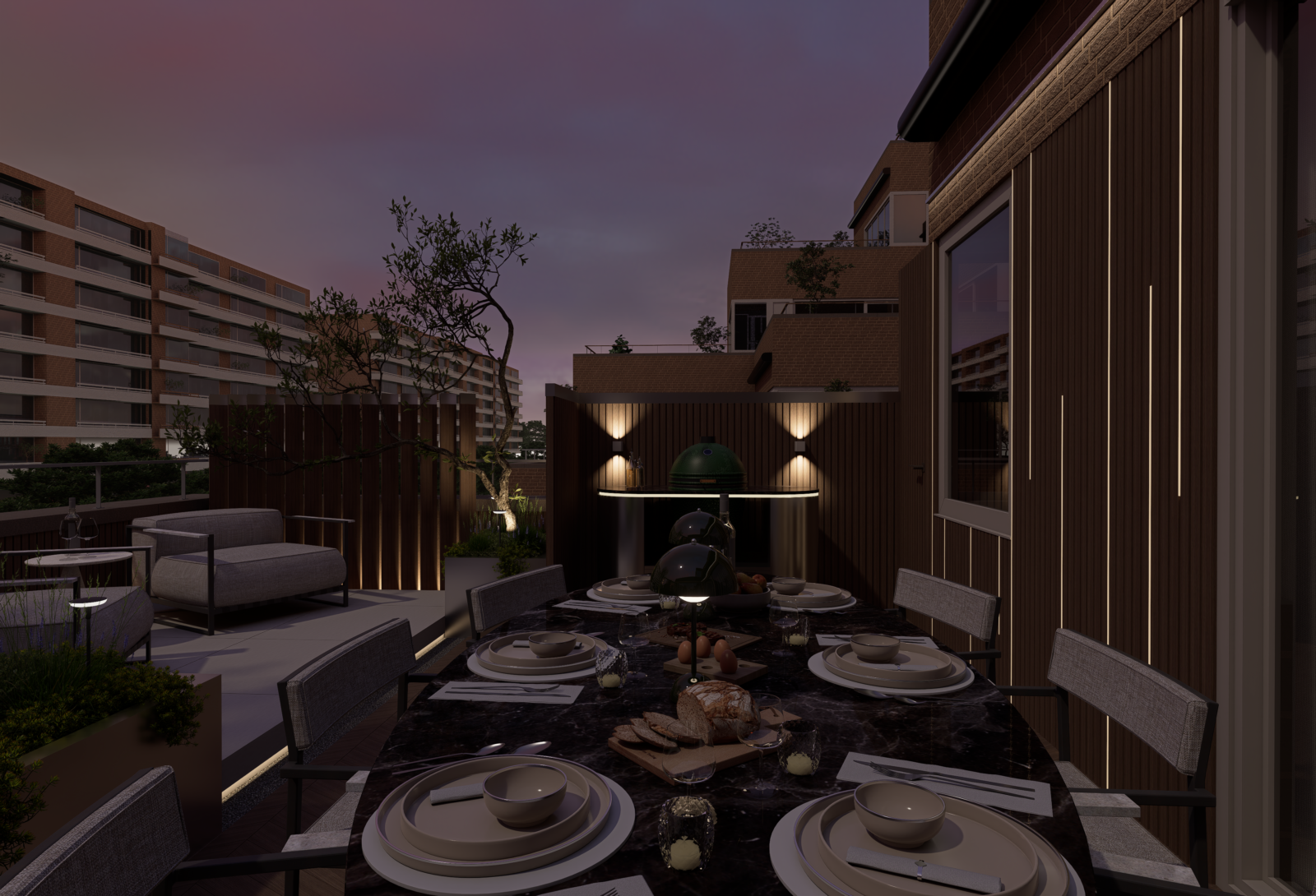 Door slim gebruik te maken van indeling, groen en materialen is een comfortabele buitenruimte ontstaan waar je kunt ontspannen, samenkomen en genieten van het uitzicht over de stad.